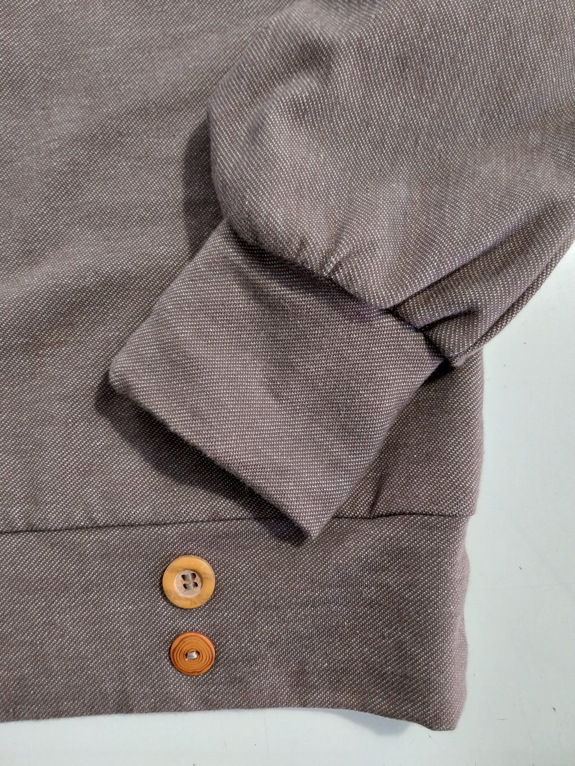 Ce modèle est confectionné à partir de fins de séries textiles européens. La ligne de décoloration du tissu est entièrement assumée pour mettre en avant la revalorisation de la matière.